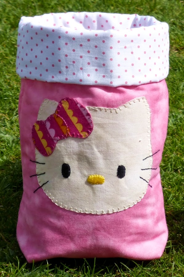 Por eso nos decidimos por regalarle unas cositas para el aseo de Hello Kitty, que seguro le iban a encantar. Además para meter esos productos hice una cestita en tonos rosas y topitos con una carita del personaje de la gatita bordada a mano.