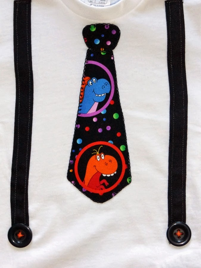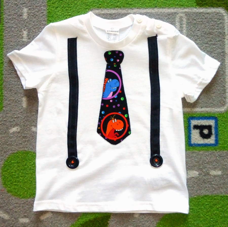Queríamos hacerle un detallito sólo para él y lo elegido fue una camiseta con una corbata bordadita en punto festón, con una tela muy divertida de dinosaurios. Cuando la terminamos vimos que faltaba algo más para que quedara más completa, así que le puse unos tirantes y unos botoncitos.