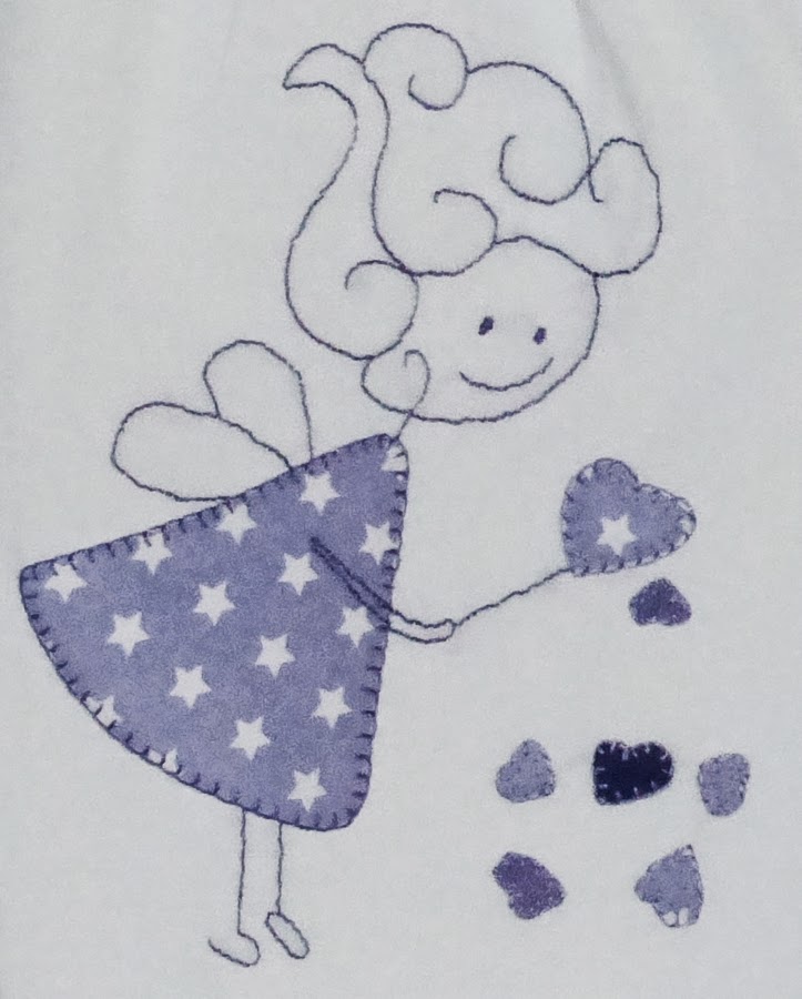 Así que busque un hada la mar de simpática y la vestí con un vestido lila de estrellas blancas. Lo demás (cabeza, brazos y piernas) lo bordé a mano con punto atrás. De su varita mágica salen un montón de corazones bordados, para repartir amor y cariño por todo el mundo.
