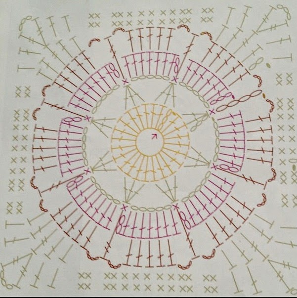 El tercer granny puede tener múltiples formas según las combinaciones de los colores que se utilicen. El diagrama parece complicado, pero en realidad és un granny que su complexidad radica en la diversidad de puntos: punto bajo, punto alto, punto medio, 3 puntos altos juntos, punto alto doble, punto raso.