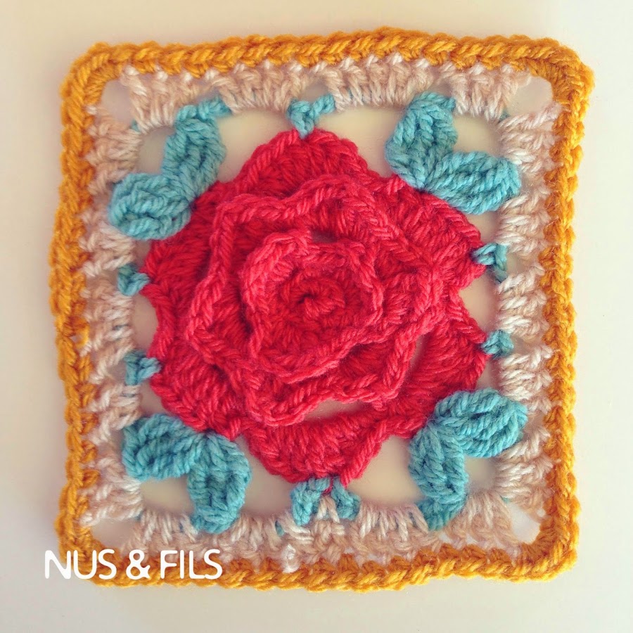 El cuarto granny es mi particular homenaje a la fiesta de Sant Jordi y a la rosa. Esta semana he publicado en el blog un pequeño tutorial de como hacer una rosa y la sección de grannys no podía ser menos. Tengo que confesar que no las tenia todas cuando lo empecé a tejer, porque tenia pánico a que me saliera como los claveles de ganchillo de las tías de mi padre, que miedo les tenia y a los vestidos de las muñecas también! El resultado me encanta y no descarto tejer más.