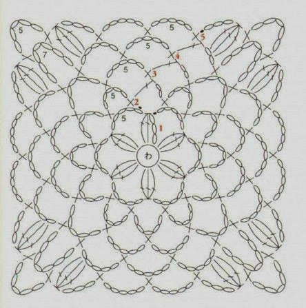 El primer granny està replet de cadenetes, és un d"aquells grannys que són ràpids de fer, tot i així cal estar atents perquè és fàcil descomptar-se. Al principi quan un s"introdueix en el món dels diagrames es perd i s"ofusca, però mica en mica es van entenent, de debò!! Jo en sóc molt fan i evito les descripcions, els passos i els llibres i revistes feixugues. Un petit truquillo és imprimir el gràfic i anar marcant amb un marcador o llapis les passades acabades.