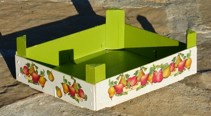 Hoy os enseño lo que he hecho con unas barquillas de fresas que he reciclado para poderlas utilizar en otras cosas. Estas en concreto están pintadas en colores alegres (naranja y pistacho) y la parte de fuera en blanco natural, además están decoradas con dibujos de frutas colocadas con la técnica del decoupage.
