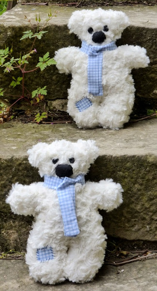 Son unos ositos de peluche la mar de dulces. Primero busqué una tela que fuera lo más amorosa posible. Es una pena que no los podáis tocar, porque en cuanto lo haces ya te gustan. Luego un patrón de un osito que fuera lo más sencillo posible, para que los gemelos los puedan coger con sus manitas, algún pequeño adorno como los ojitos y la nariz y una bufanda, en este caso con una tela de cuadritos vichi en azul celeste.
