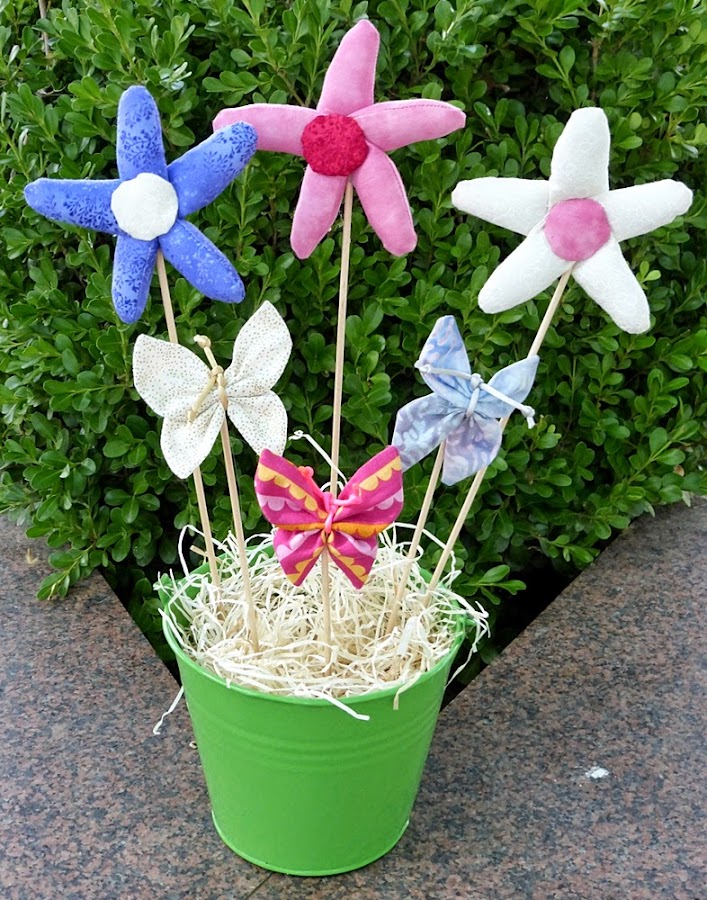 Son unas flores de tela combinando tejidos rosas, morados y blancos y también unas mariposas, en esos mismos tonos, todo ello colocado en un cubito de metal, muy gracioso.