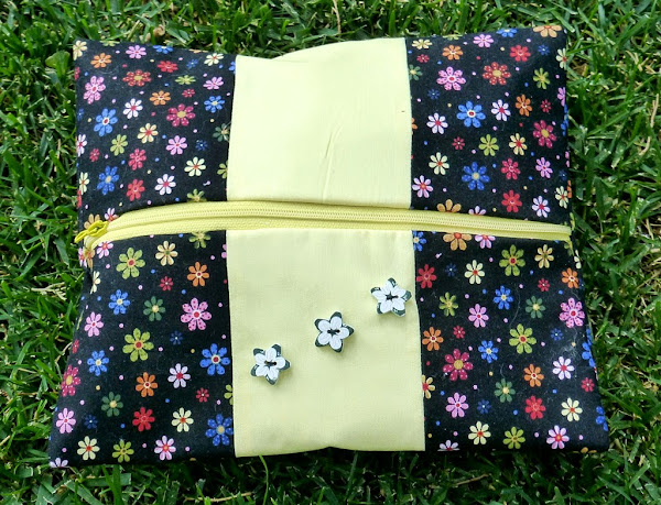 Las telas elegidas son una con fondo oscuro y florecitas de colores y la otra un amarillito claro. Para decorar unos botones en forma de flor estrellada con detalles en negro. Espero que os guste y si necesitáis una, para vuestra maleta, solo tenéis que decírmelo, seguro que diréis: ?MIRA QUE MAJA?.