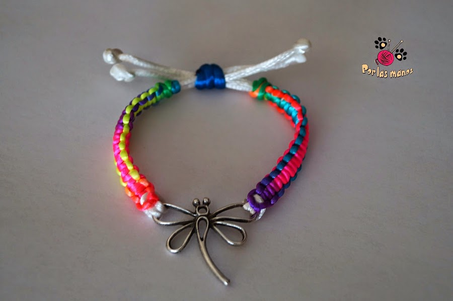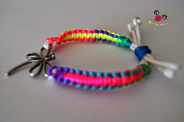 Doy por acabado el rollo de cola de ratón de colorines que tengo con esta pulsera que he hecho, como la del ancla, pero con una libélula. ¡Espero que os guste!