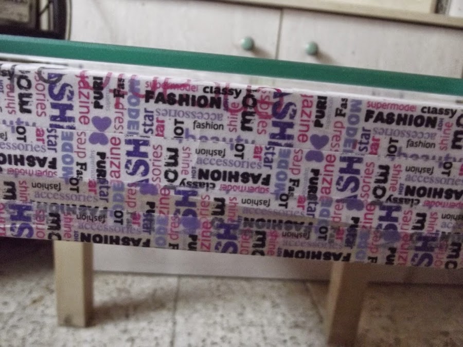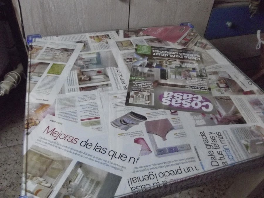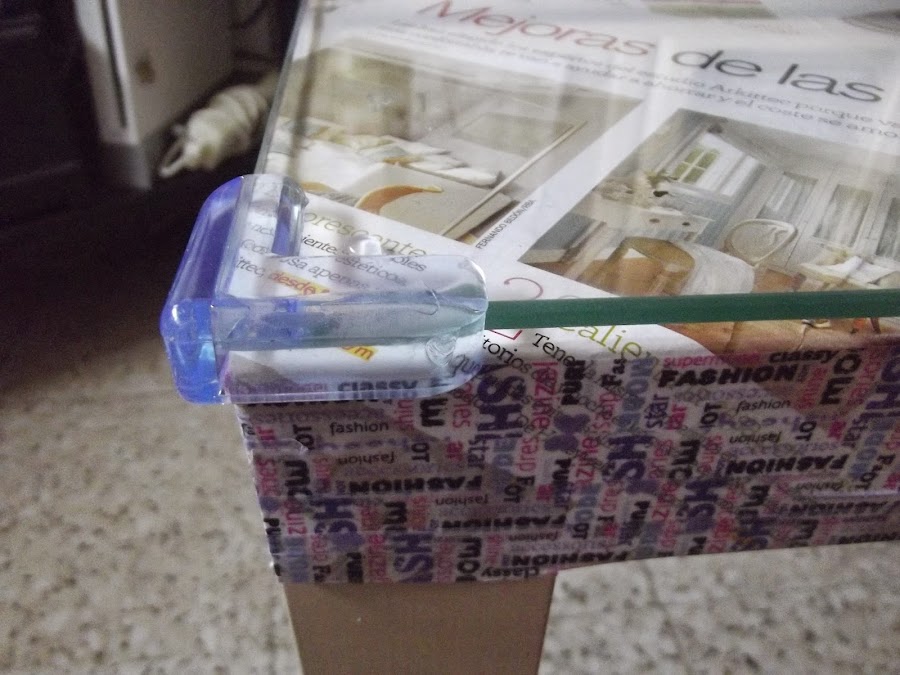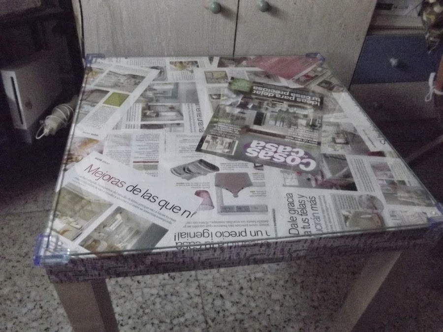 Proceso:Se deshoja una a una la revista s untan kon pegamento en barra y s pegan komo el papel d la pared pasándole un trapito d dentro hacia fuera hasta rellenar toda la mesa (si kereis hasta las patas )y s adornan los "kantos" kon wasi tape.Se deja secar; yo la deje mientras m hacían el kristal y kompraba las lagrimitas y los protectores d eskina.El resto ya s deduce no ? s pega el kristal en las 4 eskinas y s l ponen los pretectores