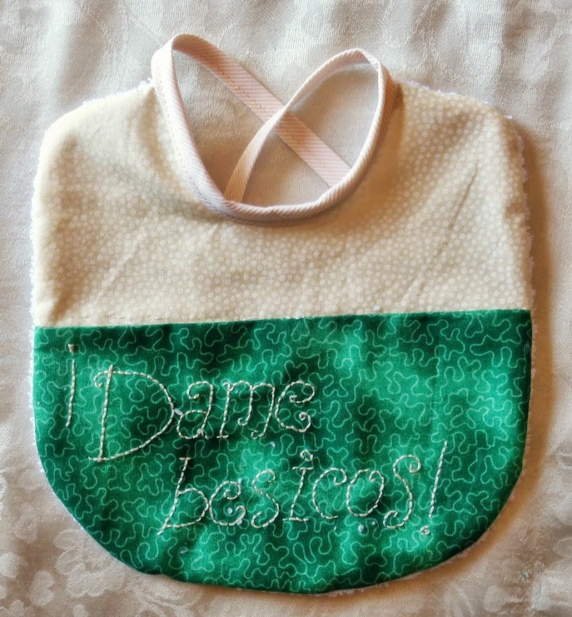 Hoy os enseño dos baberos, que nos invitan a echarles piropos a los bebes. Uno en el que se lee ?Dame besicos? y en otro ?Échame flores?. Las combinaciones de telas son blancas y verdes (como no podía ser de otra manera en estos días).