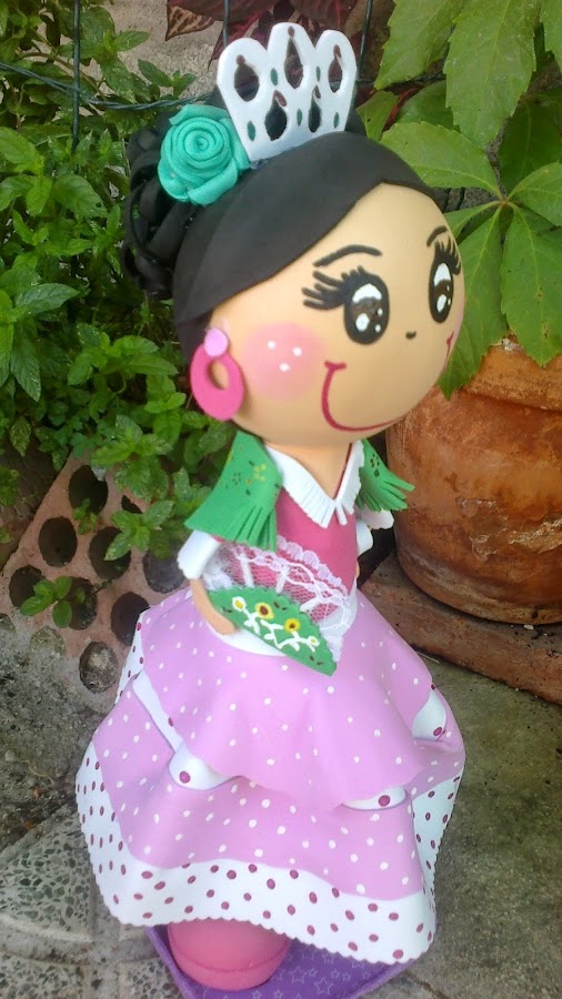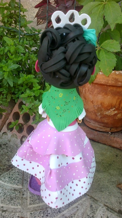 Esta fofucha flamenca fué un encargo de una apasionada de la Feria de Abril a la que le hacía mucha ilusión tener su fofucha sevillana. Es un poco más grande de lo normal porque la quería con muchos volantes. Está hecha 100% de goma eva exceptuando las perlas de los pendientes y el collar. Incluso los lunares del vestido son pequeños trozos de goma eva pegados y el mantón y el abanico son pintados ...