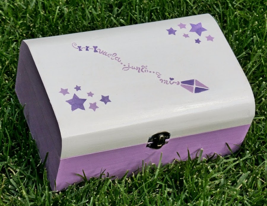 El trabajo de hoy es un baúl pintado a mano en tonos violetas, malvas y blancos, que es una combinación preciosa y muy elegante. En la parte superior lleva un dibujo hecho con plantilla en el que se lee un mensaje positivo, dedicado a la persona que reciba este baúl. "Vuela junto a mí".