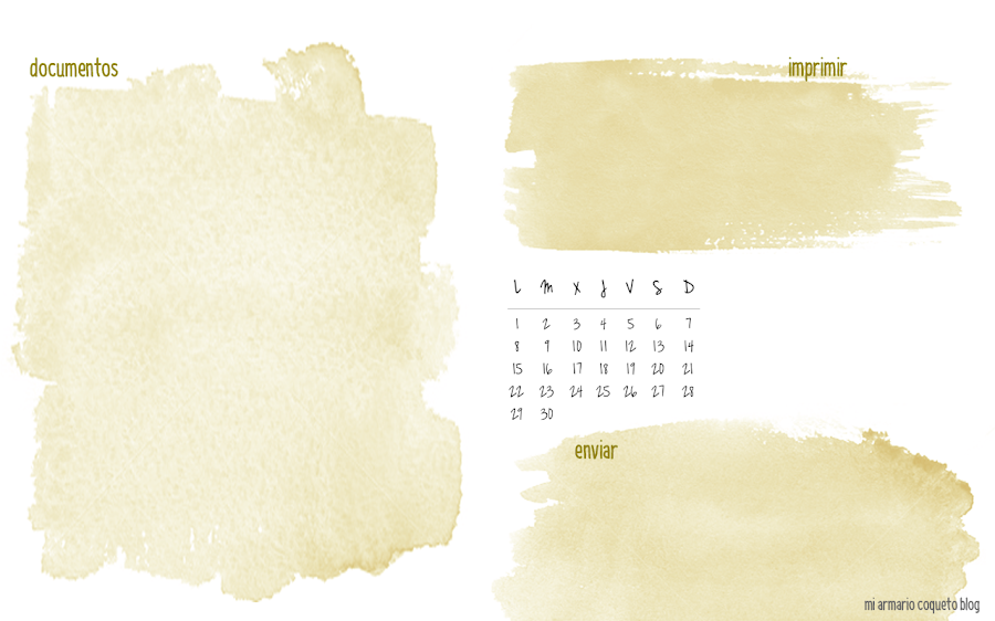 Como sabéis, siempre tengo el escritorio hecho un caos y nunca encuentro los documentos importantes, así que he dividido el escritorio en tres categorías: imprimir, enviar y el gran saco de documentos donde va el resto. Más o menos en el centro he colocado el calendario de este mes para estar siempre al día.