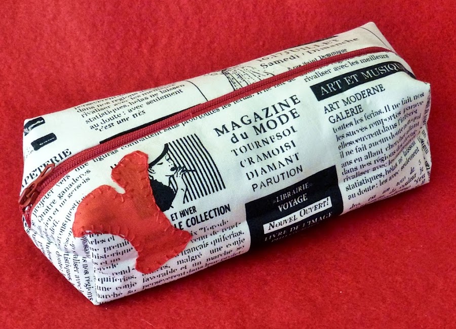 La tela elegida fue con un diseño de periódico, que combinado con rojo hacia un contraste fantástico y para rematar la inicial de la destinataria bordada con festón, para que el estuche sea más personalizado todavía.