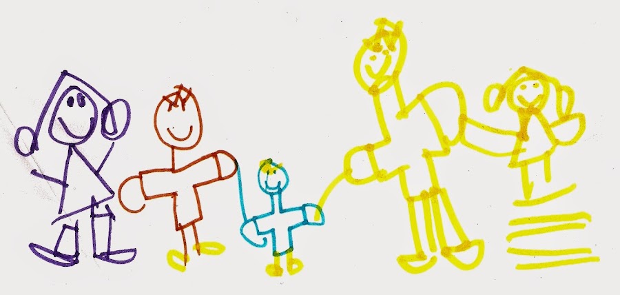 Este dibujo de Ikram me encantó porque nos dibujó a toda mi familia sonrientes y de la mano (fijaros como se dan la mano unos muñecos a otros, ¡me encanta!) junto a ella, ya que íbamos a pasar unos días de vacaciones alegres y todos juntos.