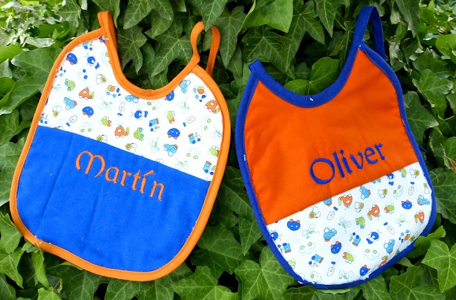 Hoy os enseño dos baberos para dos gemelitos, esta vez no son iguales pero sí que son en la misma gama de telas. Están hechos con una tela de cochitos combinada con naranja y azulón. Una combinación alegre y divertida, en la que he intentado mezclar las telas de manera distinta en cada uno de los beberos.