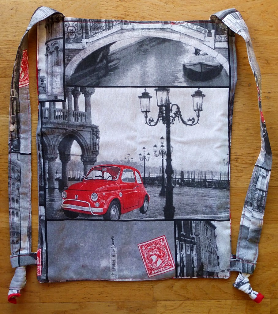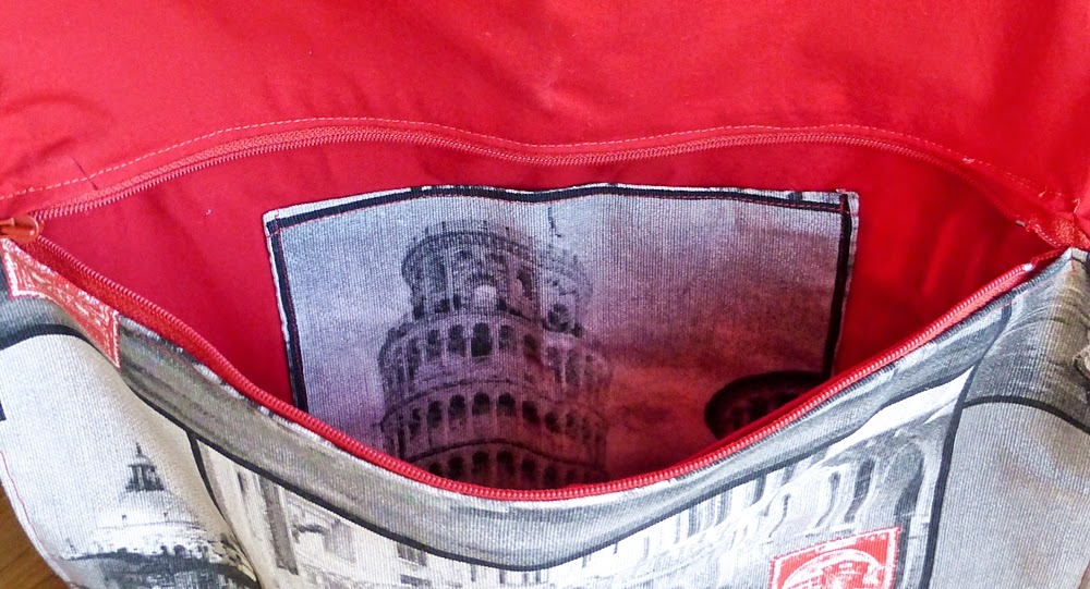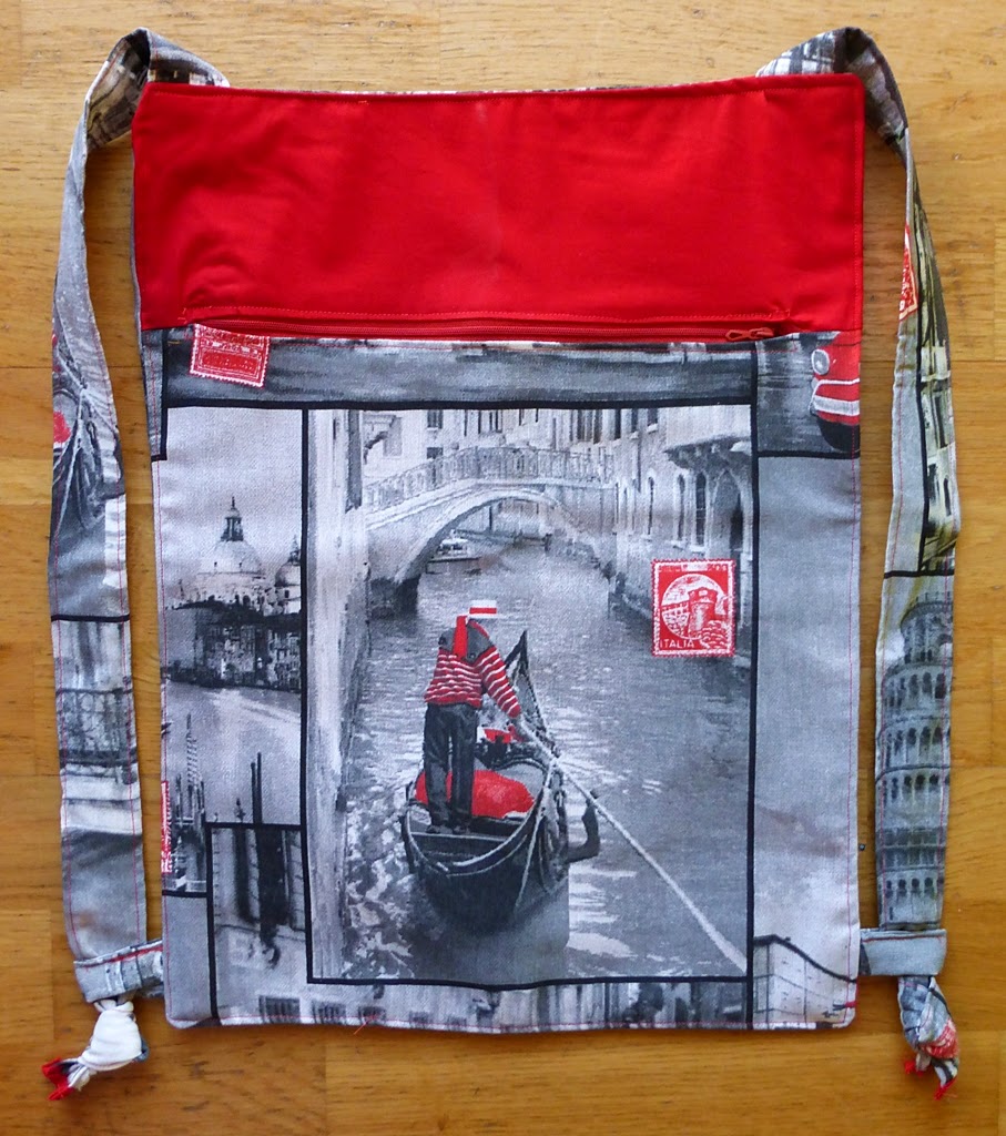 Se trata de una mochila, ideal para hacer viajes, ya que es muy cómoda y además caben muchas cosas. He combinado la tela "italiana" con un rojo intenso creando una composición chulísima y además dentro de la mochila, aunque no sé si lo apreciareis muy bien en la foto, un bolsillo con la torre de Pisa.