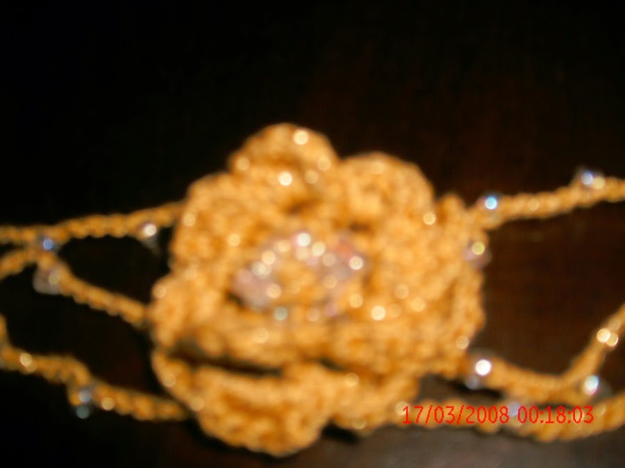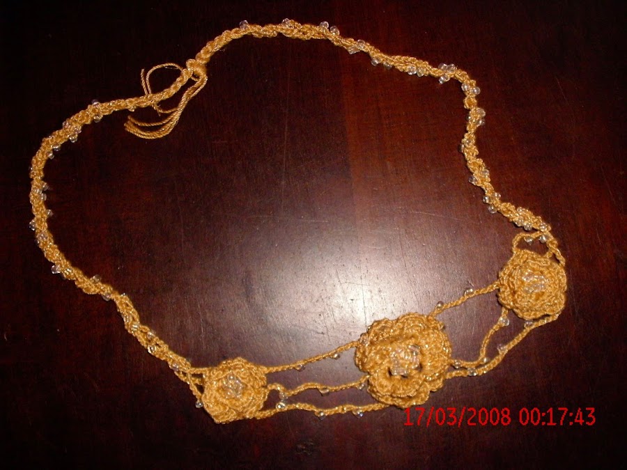 ESTE COLLAR LO TEJÍ HACE MUCHO TIEMPO, ESTA TEJIDO EN LANA FINA A LA QUE LE INSERTE UNAS CUENTAS DE VIDRIO PEQUEÑAS Y A MEDIDA QUE LO TEJÍA LAS DISTRIBUÍA PRIMERO HICE LAS ROSAS, LA DEL CENTRO ES MAS GRANDE Y LAS UNÍ A LAS OTRAS, UNA DE CADA LADO, CON CADENAS TEJIDAS, ESTAS LATERALES SON MAS PEQUEÑAS,