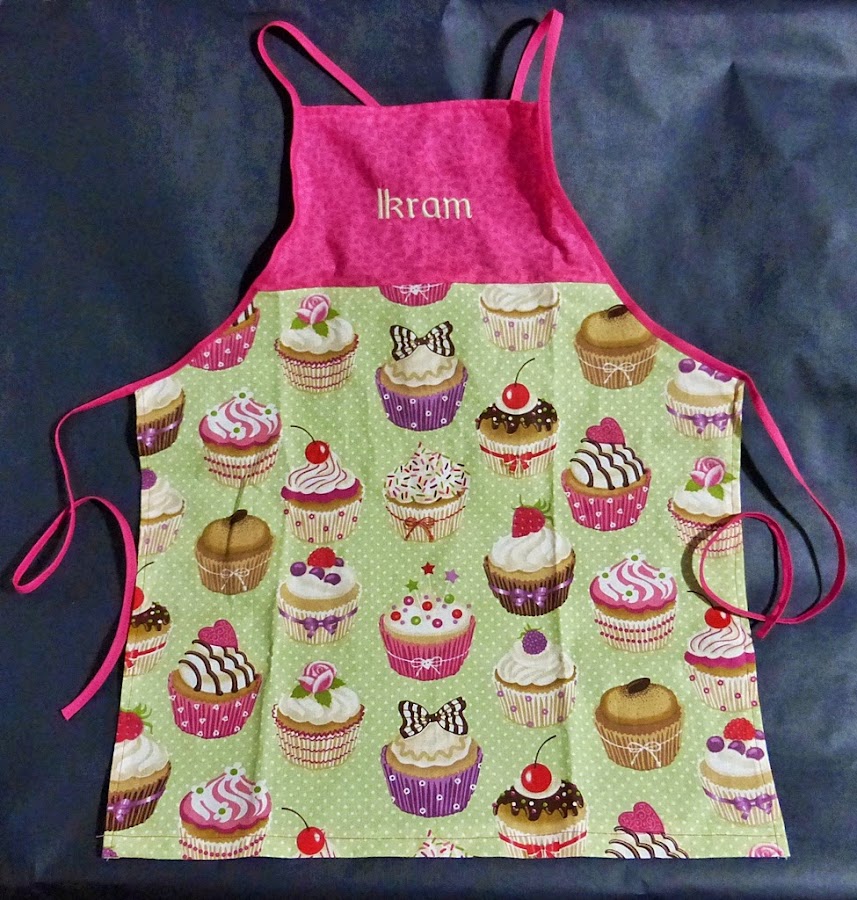 Así que para su cumpleaños decidí hacerle un delantal muy apropiado para hacer sus dulces. Una tela de cupcakes, combinada con fucsia y por supuesto, con su nombre para que le salgan estupendos todos los postres.
