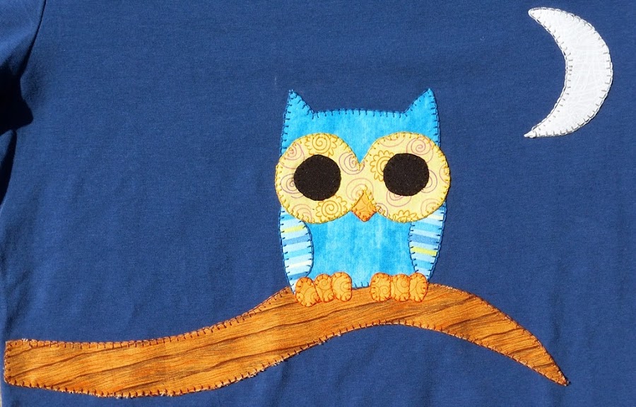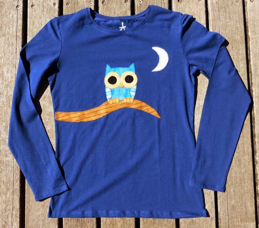 Hoy os traigo una muy chula con un búho colocado sobre una rama en tonos azules y naranjas, que hacen una combinación perfecta con el fondo de la camiseta que es un azul oscuro, y que simula perfectamente que es la noche sobre la que destaca el búho y la luna llena.
