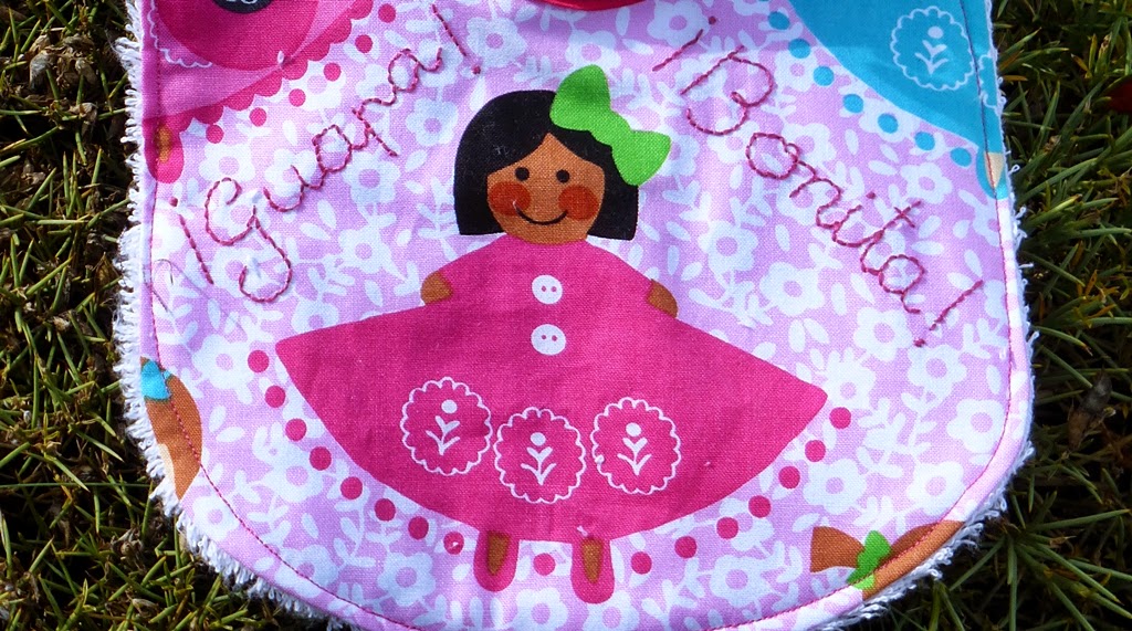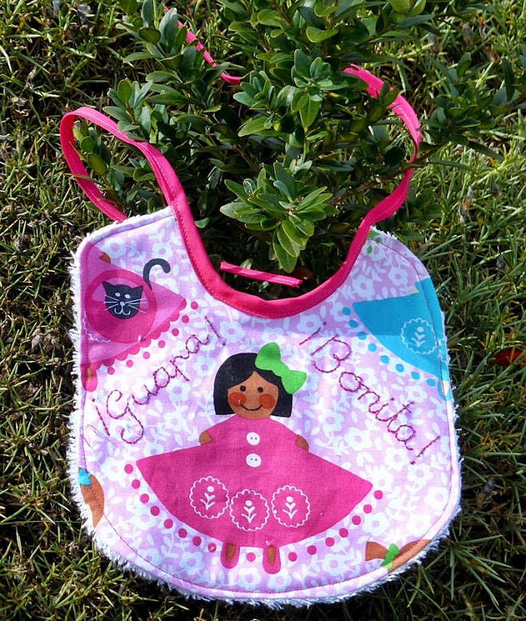 Es un tejido muy divertido que ya llenaba el babero, pero para rematarlo, he añadido unos buenos piropos: ¡Guapa! ¡Bonita!, seguro que a la pequeña Lola se lo dicen un montón de veces, y cuando lleve el babero más.
