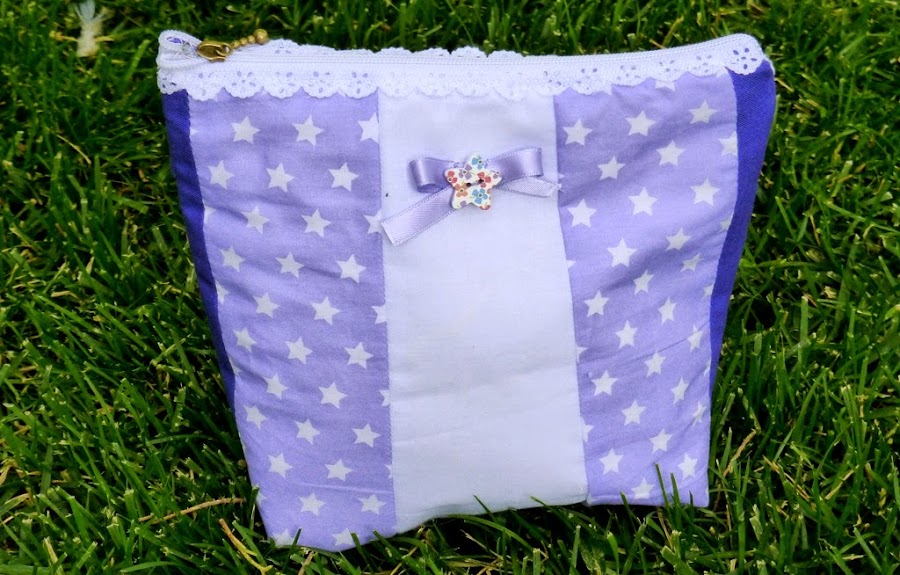 Lo colores elegidos son una mezcla de morados, violetas y blancos, rematados con una cremallera de puntilla, un lacito y un botón de estrella. Una combinación muy dulce para un neceser muy práctico.
