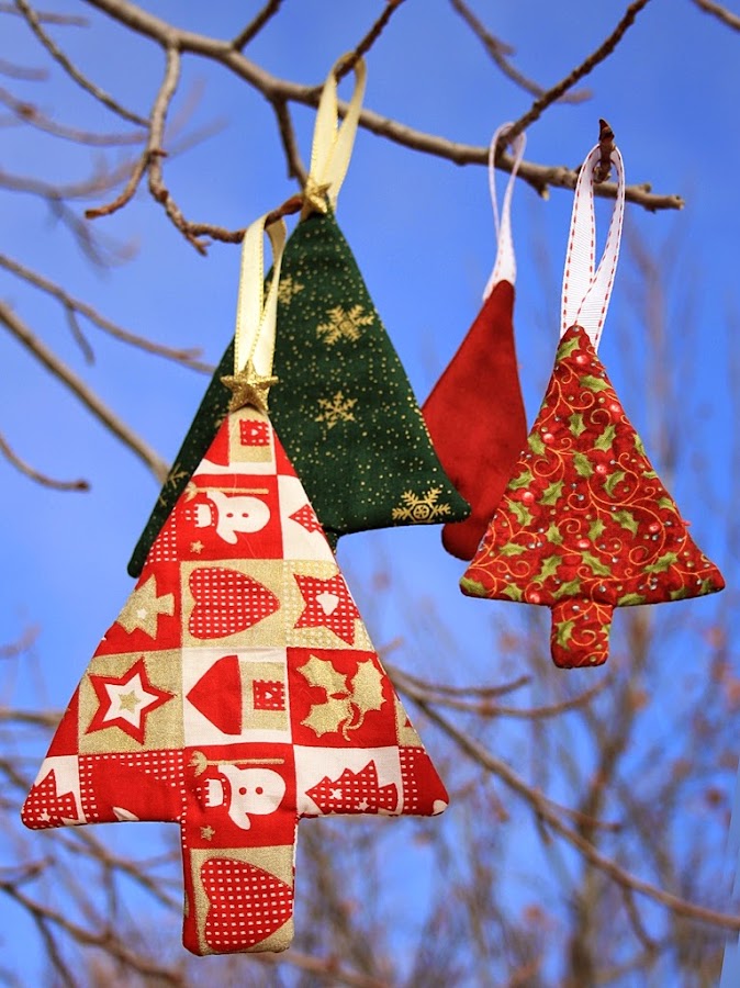 Así que hoy os doy una idea para que vayáis adornando vuestro hogar. Se trata de unos arbolitos de varios colores hechos con telas navideñas, que sin duda le darán un aspecto muy simpático a vuestro árbol de Navidad o a las puertas de vuestras casas.