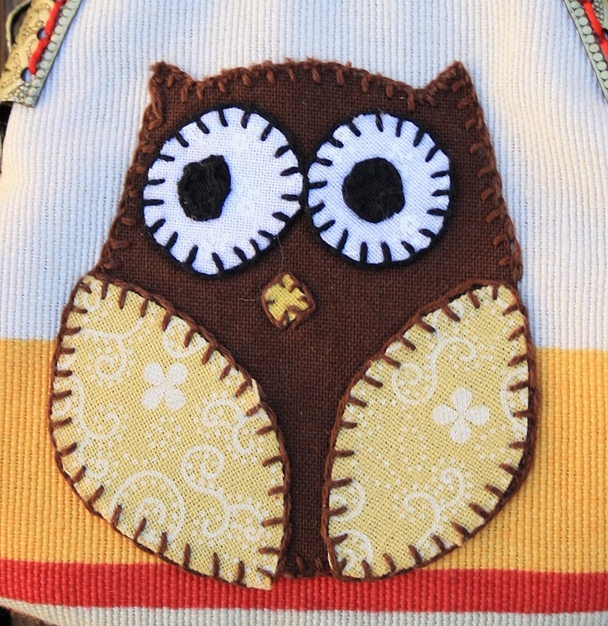 Está hecho en una tela de cuadros muy alegres, con tonos naranjas, rojos y amarillos, y encima lleva aplicado un búho muy simpático en tonos marrones y amarillos. La boquilla tiene un tono de oro viejo y el pespunte es en rojo, lo que remata esta labor tan divertida.