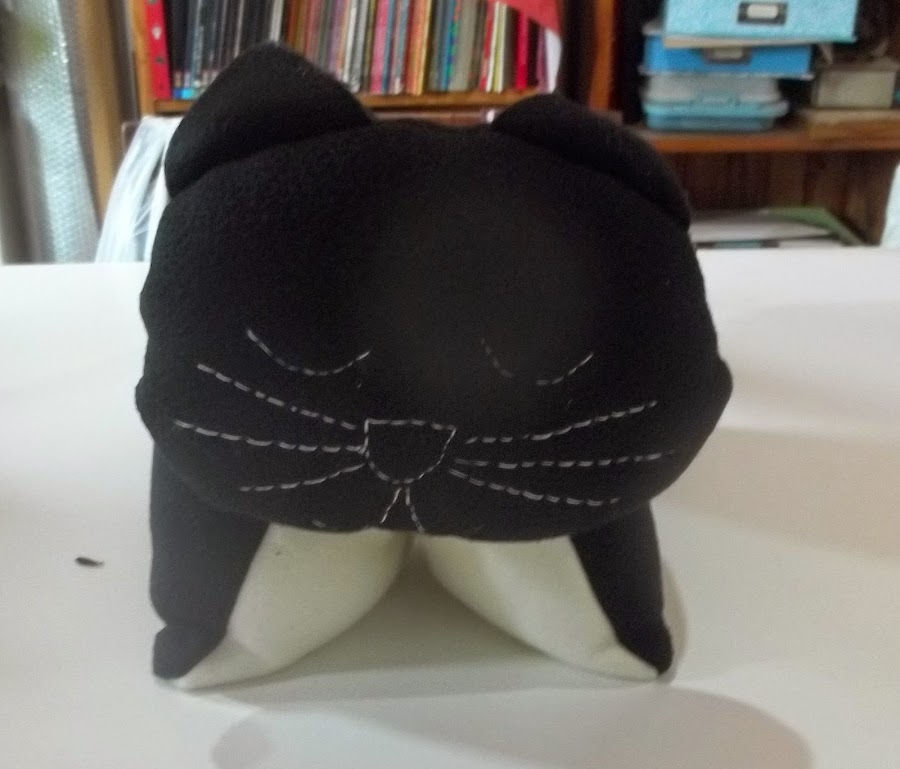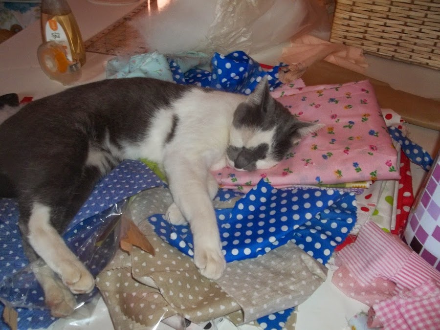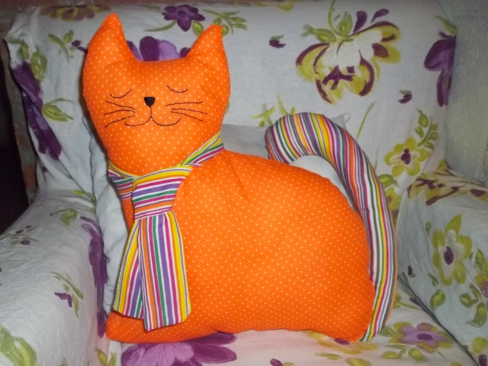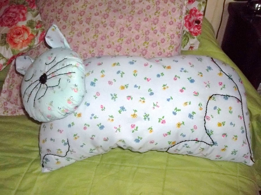 Ella es Juana, mi gata malcriada. A su madre, que también era mi malcriada, la encontré en un árbol enfrente a mi casa. Su madre murió desgraciadamente, pero la tengo a ella. Estos son algunos de los almohadones-juguetes que hice con forma de gato.