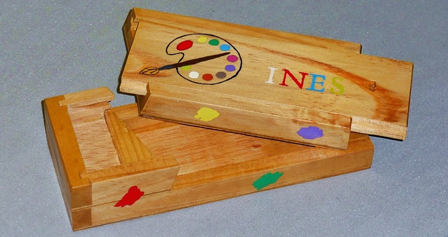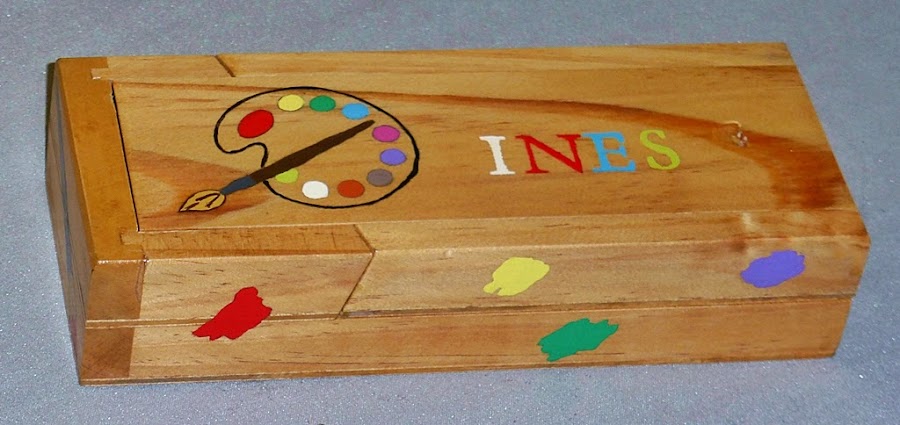 Nos dijeron que era muy aficionada a la pintura, así que el tema del plumier lo tuvimos claro: paleta de colores, pinceles, manchas de muchos colores y, por supuesto, su nombre.