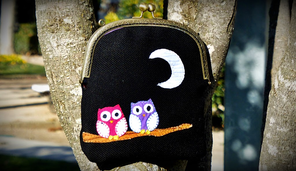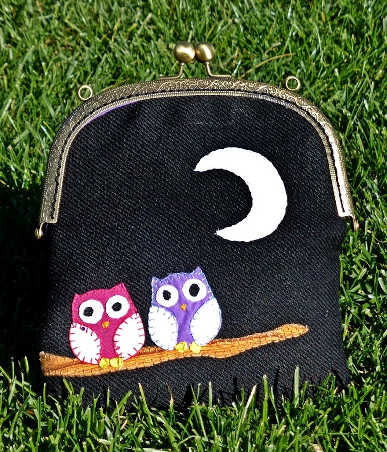 Hoy os enseño un bolsito hecho con una boquilla en oro viejo. La pieza es en color negro y como decoración lleva unos búhos y una luna aplicados, en tonos rosas y morados. Una combinación súper elegante y que ha gustado muchísimo. Solo falta ponerle una cadenita y tenemos el bolso listo para lucir en cualquier ocasión.