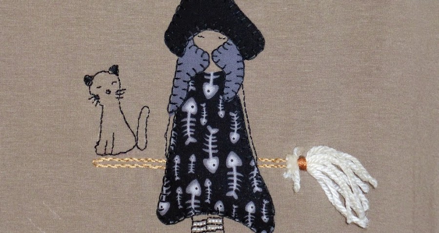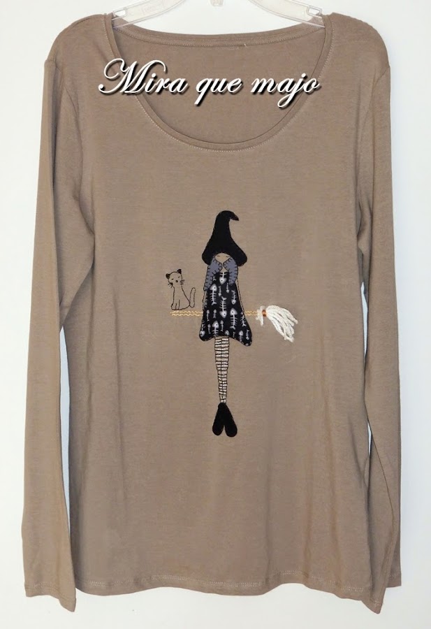 Decidí aplicarla en una camiseta y bordar las partes que no son aplicadas. Además también lleva el detalle en relieve de la escoba, que está hecho con lana.