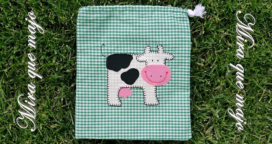 Hoy os enseño una bolsa de almuerzo muy chula. Está hecha en una tela de cuadrito vichi en blanco y verde y como adorno lleva una vaca aplicada. Sin duda una bolsa muy práctica, que hará que los más pequeños lleven su almuerzo al cole súper contentos. Os aseguro, por experiencia, que les encanta enseñar sus nuevas bolsitas.