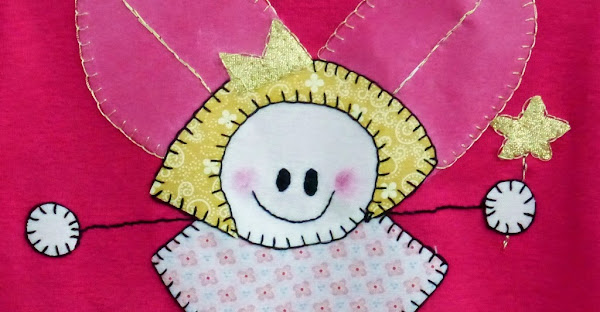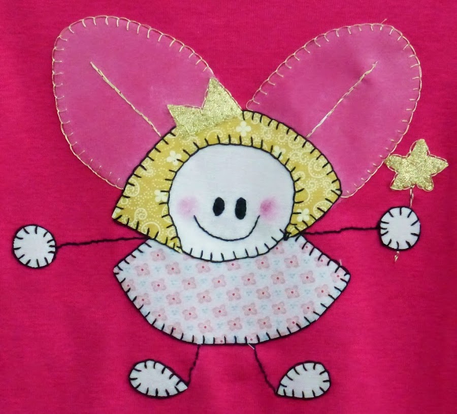 Hoy os traigo una camiseta que hice para Alba, que tiene por protagonista a un hada regordeta y muy graciosa, aplicada en una tela de un rosa fucsia precioso, en el que destacan muchísimo los dorados y los rosas claros utilizados en el trabajo.