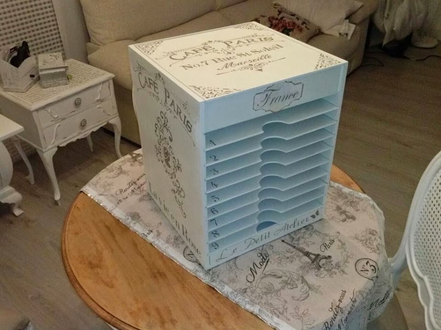 El modelo medio tiene un precio de 32 euros, envio no incluido, con cajon superior, tapa elevable y 7 bandejas extraibles y regulables, como se ve en la foto 2 y 3