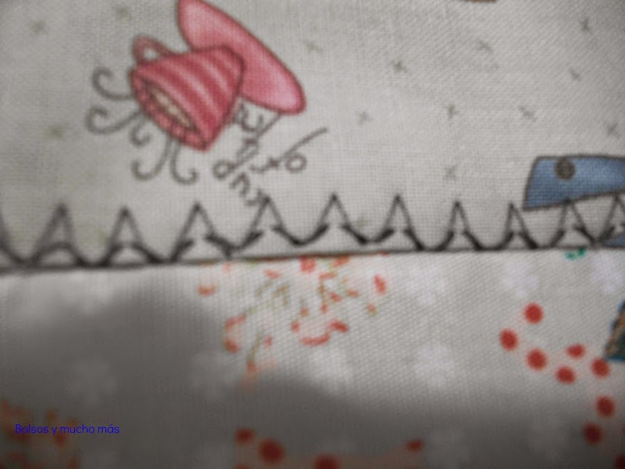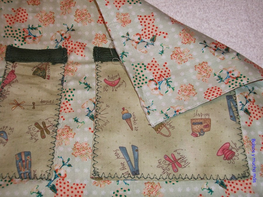 Decidimos dónde colocarlos y cosemos a una de las telas del delantal, en mi caso en vez de hacerlo con un pespunte recto le he hecho un festón.
