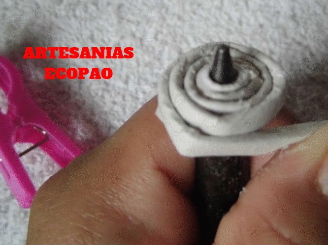 23. El paso anterior solo lo hacemos hasta cubrir una parte de ambos lados. Y en el centro del aro, envolvemos un rollito y pegamos