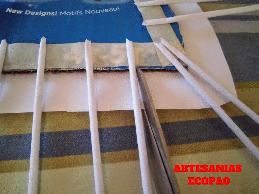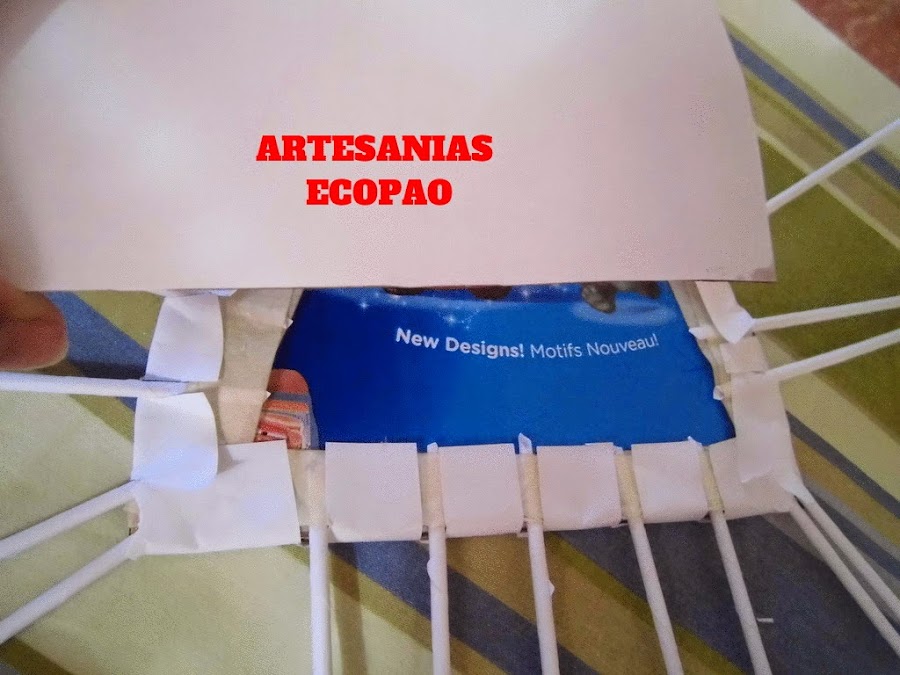 3. En el cartón grueso, pegamos los rollitos que serán los pilares del tejido, puedes pegarlo con silicona(fría o caliente), pegamento, o como en mi caso con ayuda de cinta de pintor.