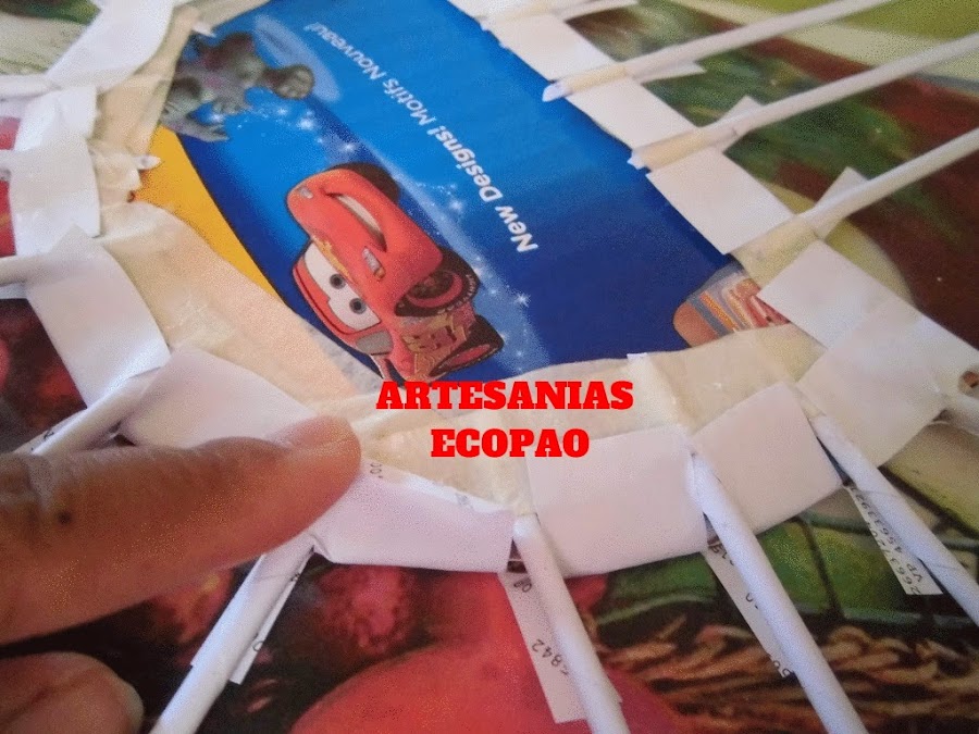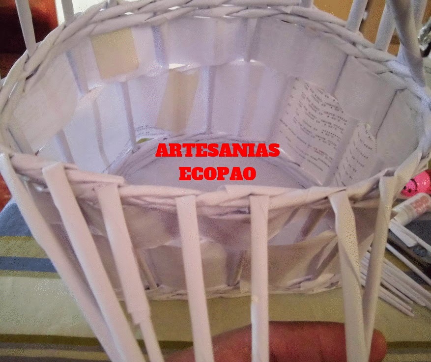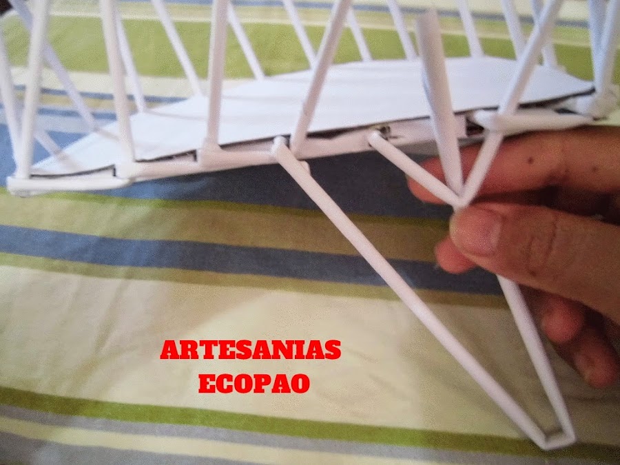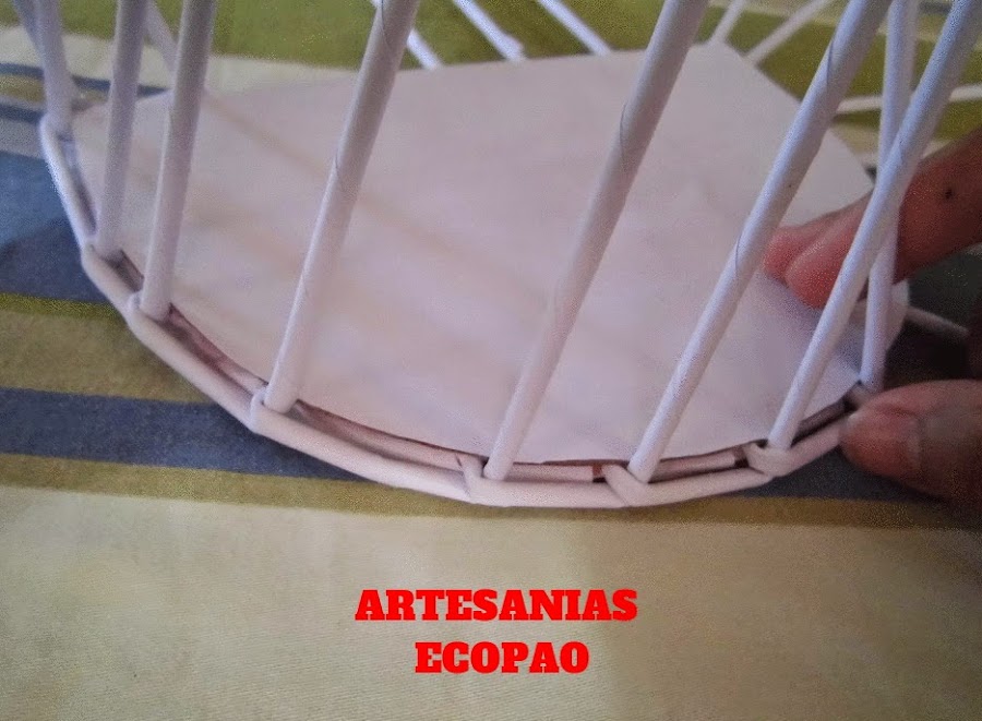 20. Vamos a realizar el aro colgante de la jaula. Abrimos un poco de espacio en la ultima vuelta que hicimos en la rueda de papel y pasamos 4 de los rollitos que dejamos del tejido final de la jaulita. Así como lo muestro en la foto.