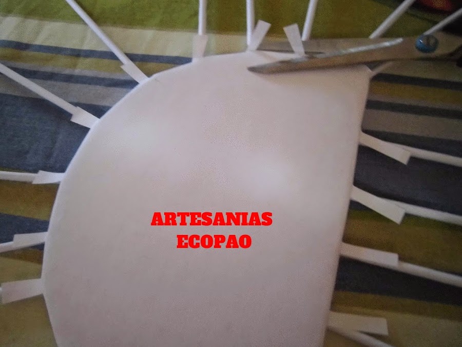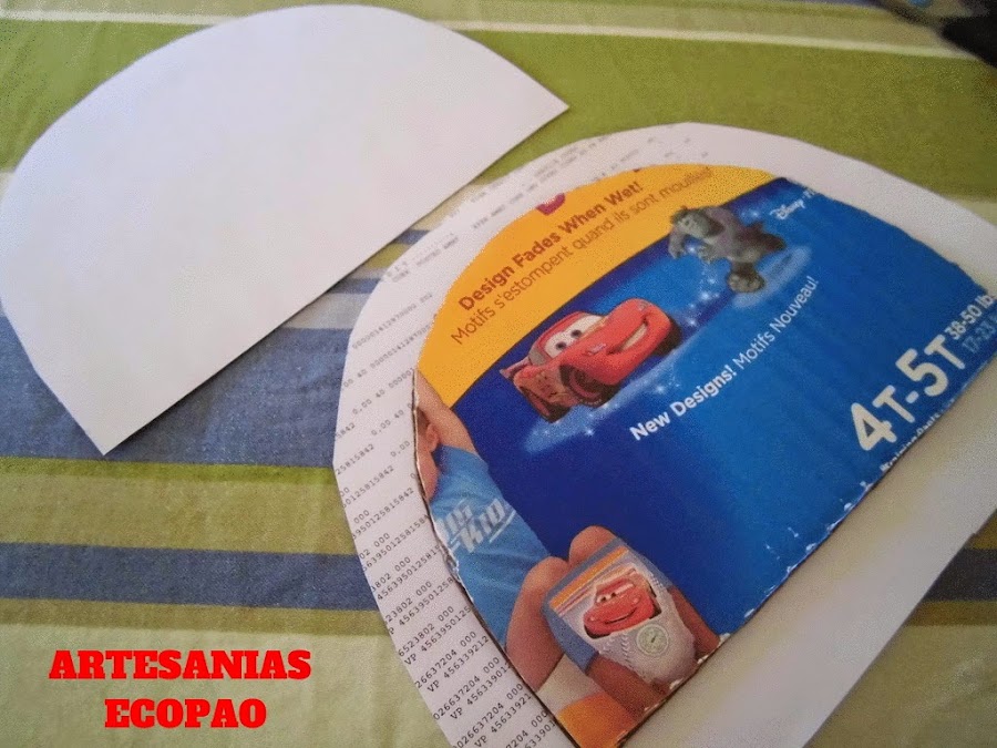 2. Forramos los medios óvalos con un pedazo de papel (de preferencia papel blanco). Tenemos que tener en cuenta que el cartón delgado se forra con el papel todo a ras y al cartón grueso se le deja una pestaña, osea algunos centímetros de distancia al rededor del cartón.