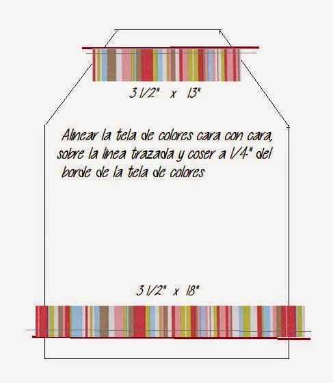 .- Colocaremos la tira de Tela B de 3 ½" x 13, alineada en la parte superior del delantal, y la fijaremos con alfileres.