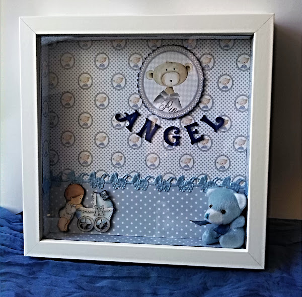 Este cuadro hago para recién nacido cuyo nombre es Angel, realizado con papel de scrapbook infantil, tira bordada con cochecitos de bebé, su nombre en goma eva y ositos de peluche para dar aspecto aún más infantil si cabe.