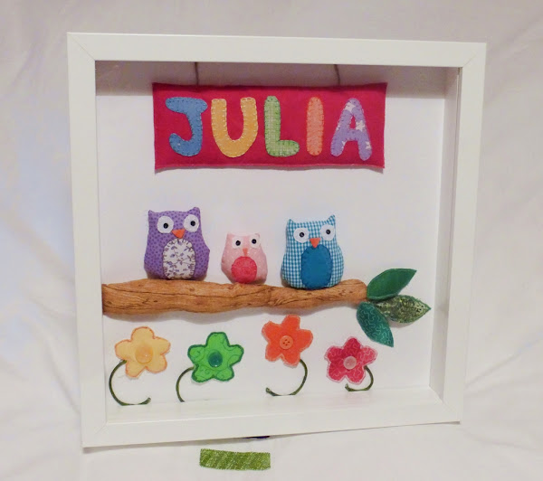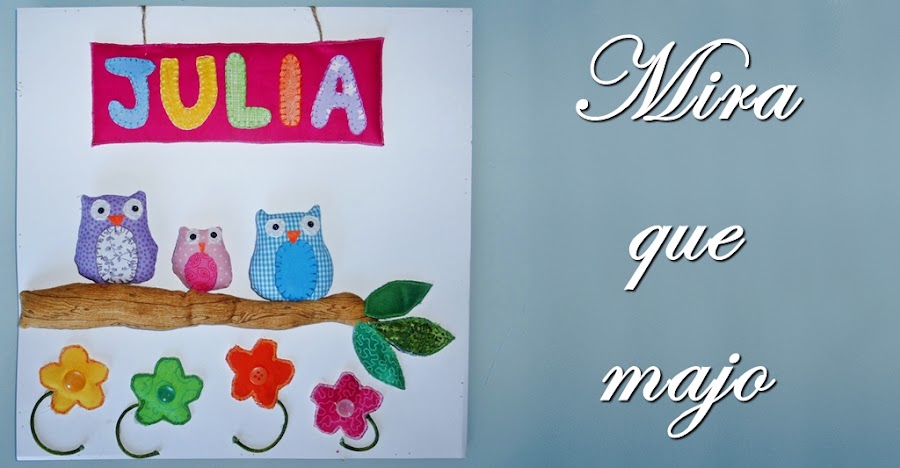 Después elegimos unos búhos, un papá, una mamá y un bebé búho que se posaban divertidos sobre una rama, por otra parte el nombre: JULIA, aplicado en una tela que colgaba de dos cuerditas y para rematar unas florecitas.