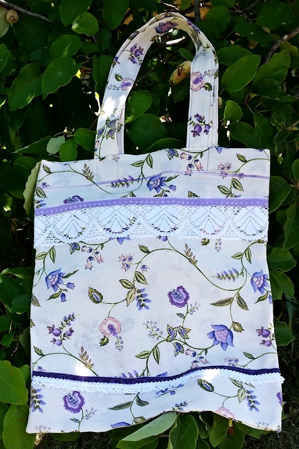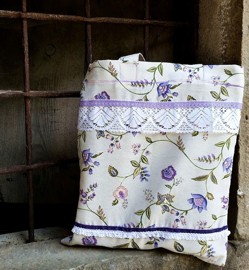 Se trata de una bolsa un poco grande en la que caben bastantes cosas y la tela elegida es de unas flores en tonos morados (uno de mis colores favoritos). Para darle un pelín más de gracia hemos puesto unas tiras de puntillas y lacitos que le dan un toque romántico.