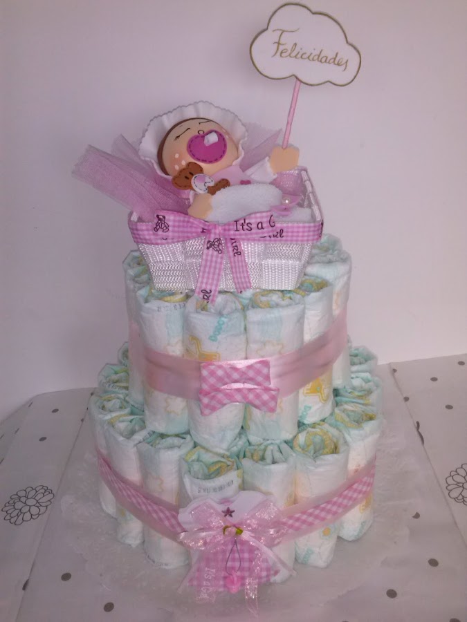 He estado algún tiempo ausente, pero os dejo la última tarta de pañales que he hecho, es para una princesa que ha nacido hace sólo 12 días.