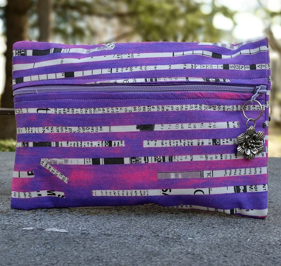 La tela es chulísima, en tonos morados mezclados con letras una combinación perfecta que para rematar lleva una florecita plateada.