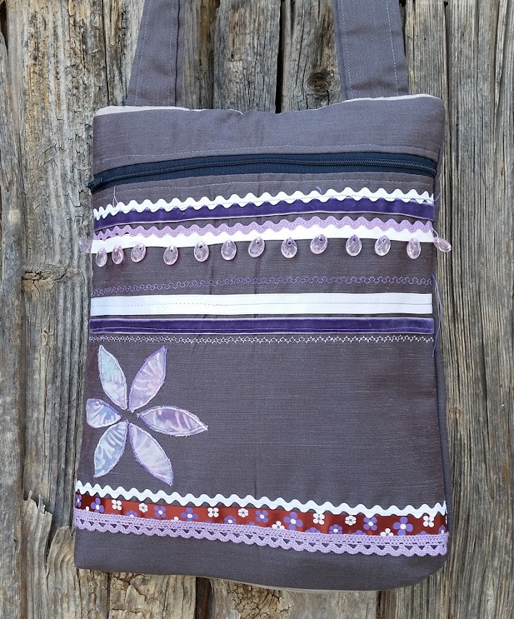 Se trata de un bolso que está decorado con un montón de puntillas, lazos y piculinas que combinan el blanco y el morado para destacar de una manera importante sobre el fondo gris del bolso.