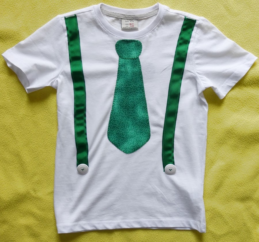 La camiseta que os enseño hoy, la he hecho muchas veces y me encanta porque el resultado es súper divertido. Es una camiseta de chico con la aplicación de una corbata y de unos tirantes, todo en blanco y verde.