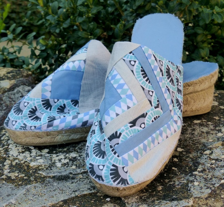 Hoy os enseño unas zapatillas en las que está todo hecho a mano. Las hice para Juani, que tiene unos pies muy delicados y tenían que ser a medida.Están realizadas con la técnica de log cabin, combinando los colores azules y grises, lo que produce un resultado muy delicado y elegante.