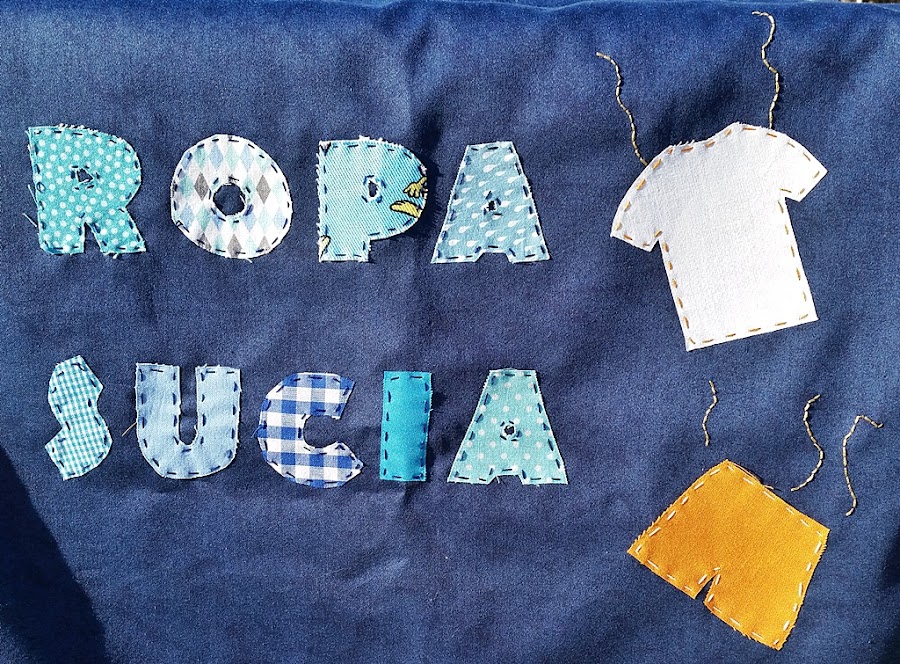 Así que usé de fondo una tela oscurita (de esas que nos manda la abuela Paqui) y para decorar unas letras en azul con distintos estampados y unas prendas de ropa que sueltan cierto tufillo. Para finalizar puse su nombre.