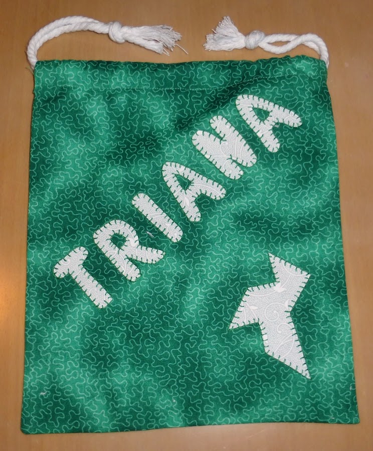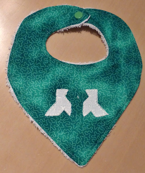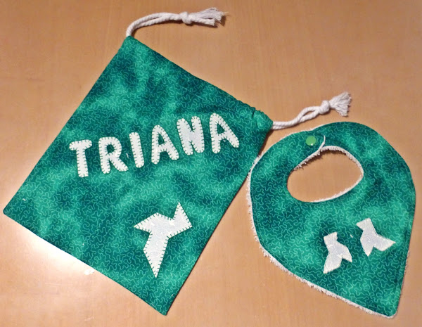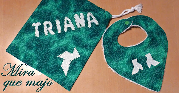 El conjunto consistió en dos bodys (que os enseñaré un día de estos), una bolsito y un babero con forma de pañoleta. Todo tenía que ser en blanco y verde y con uno de los símbolos más importantes de nuestra ciudad: las pajaritas.